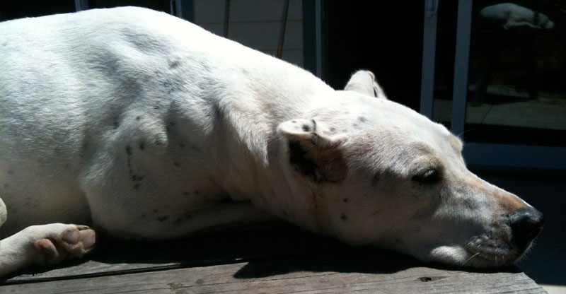 This example also uses the column text and some moving images, that rotate when you hover over them. There is also the image of my dog Darby saved as a png24 file -outlined and with a shadow created in Photoshop, that is displayed over the right column.