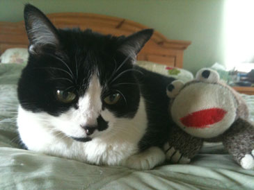 This is my kitty Sophie. She loves my sock frog and carries it around so I find it in mysterious places. My cats must think it has catnip in it - although it is so big compared to their catnip toys. I hide it from them, but they find it and then I have to search for it too. I figure it gives my frog adventures to go on. He ends up out in the hallway a lot. Or down on the stairs. Other times they take it in the closet and hide it in a corner where it is dark. At least they don't chew on it. Or tear him apart. The sock frog was a gift from my husband for Christmas one year. A little different than a sock monkey.